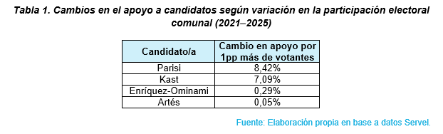 Por ejemplo, se puede analizar cómo cambió el porcentaje de votos obtenidos por candidatos en 2021 y 2025 en relación con el cambio en la cantidad de votantes totales. La tabla 1 muestra el valor promedio de dicha relación para cada candidato que estuvo presente en ambas elecciones. Es decir, la tabla muestra cuántos puntos porcentuales aumenta (o disminuye) el porcentaje de votos de un candidato cuando el total de votos en la comuna aumenta en un punto porcentual, capturando así cómo le va al candidato (en comparación a 2021) cuando participa más gente.