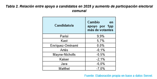 Sin embargo, lo anterior no nos da luces para ver qué pasó con los/as candidatos/as que no participaron en las elecciones de 2021. Para abordar esto, la Tabla 2 muestra cómo varía el porcentaje de apoyo comunal de cada candidato o candidata de 2025, con relación al cambio en el total de votantes en cada comuna (comparando 2021 con 2025).