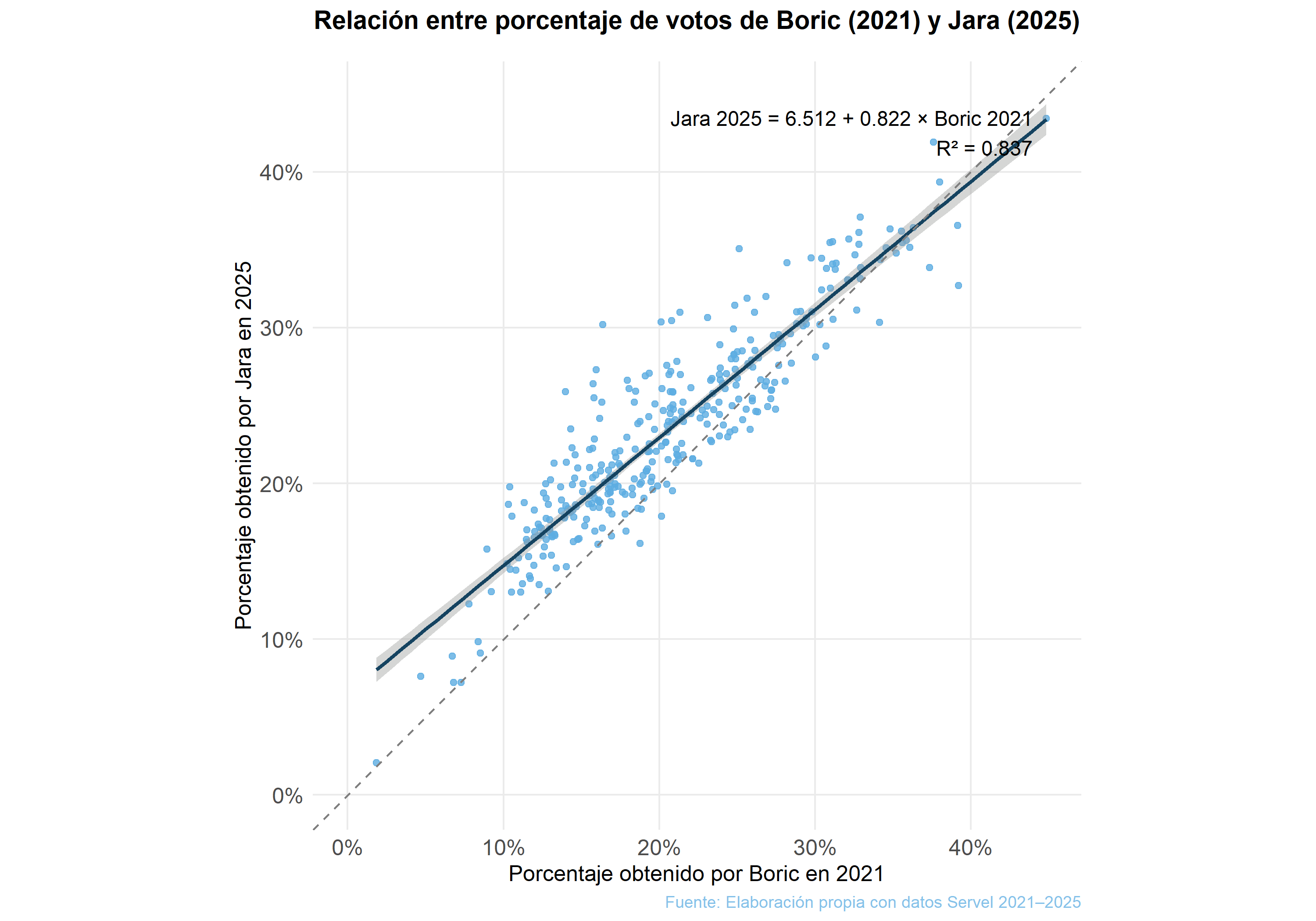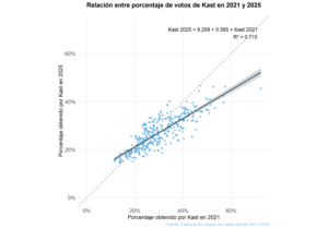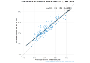 Además, se observa que la línea de regresión está sistemáticamente por sobre la línea punteada de 45°, que en el gráfico representa los puntos donde Jara habría obtenido exactamente el mismo porcentaje que Boric en cada comuna. Que la recta estimada quede por encima de esa diagonal implica que, en promedio, Jara no solo reproduce el mapa electoral de Boric, sino que lo amplifica: en muchas comunas obtiene un porcentaje mayor al que Boric logró en la primera vuelta de 2021. Dicho de otro modo, es decir, donde a Boric le fue bien en 2021 a Jara le fue aún mejor en 2025.