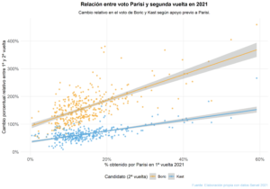 El gráfico a continuación ilustra cómo se relacionó el apoyo comunal a Parisi en primera vuelta con los resultados de Boric y Kast en la segunda. En términos simples, el gráfico muestra esa relación de manera sencilla: en cada comuna, se compara cuánto votó Parisi en la primera vuelta con cuánto subió (en términos relativos) el voto de Boric y Kast entre la primera y la segunda vuelta.