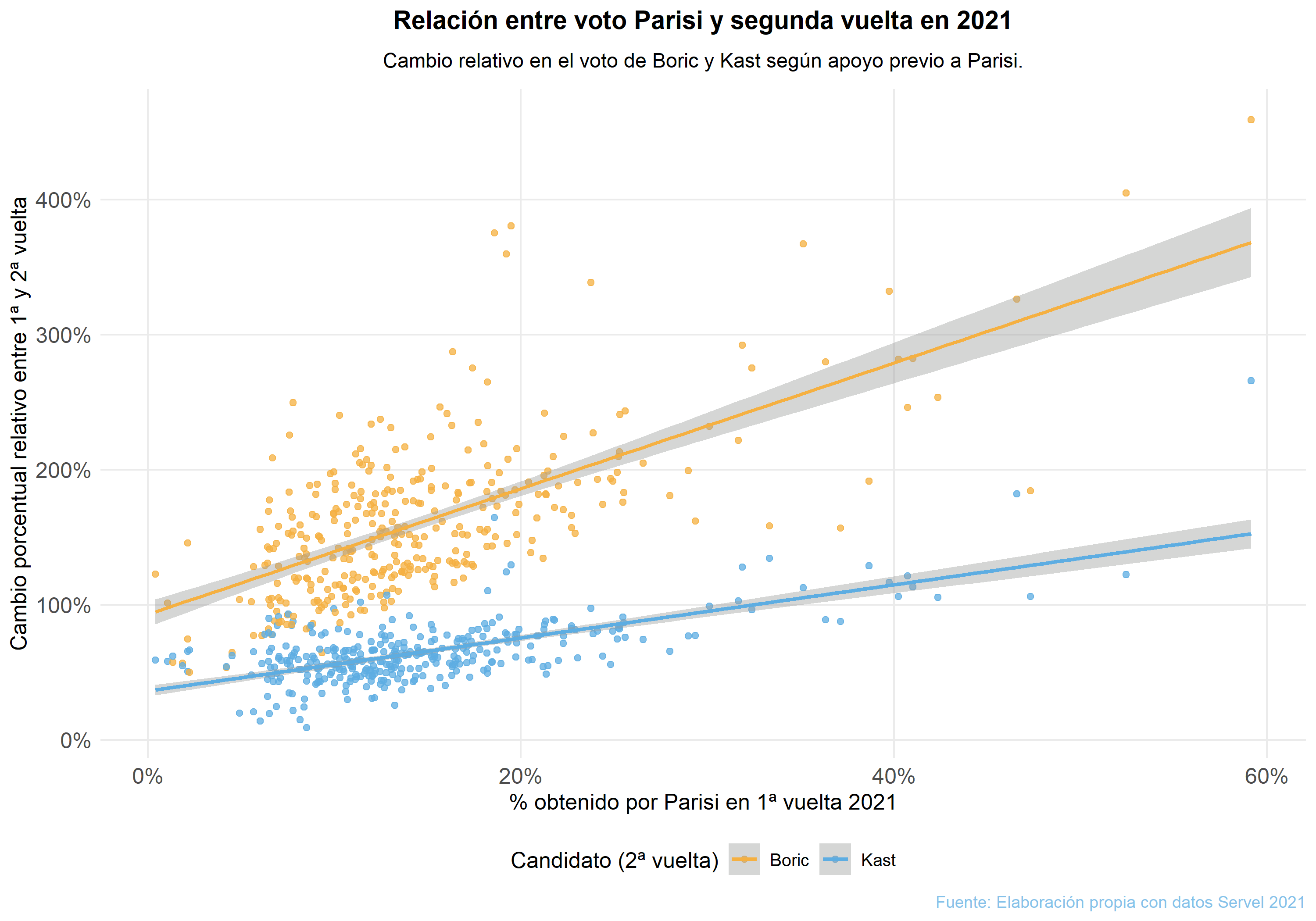 Los resultados indican que existe una relación positiva para ambos candidatos, pero más fuerte en el caso de Boric. Su pendiente estimada (0,0466) es notablemente mayor que la de Kast (0,0197). Esto significa que, en 2021, las comunas donde Parisi obtuvo más apoyo tendieron a votar proporcionalmente más por Boric en la segunda vuelta que por Kast. En otras palabras: allí donde Parisi fue fuerte, Boric creció más.