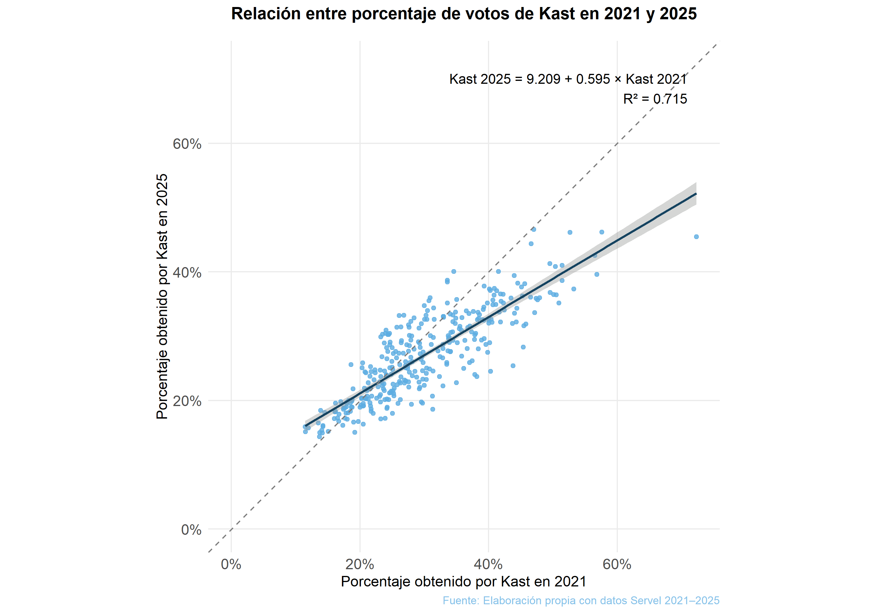 En el caso de Kast, también se aprecia un patrón claro: las comunas donde obtuvo altos porcentajes en la primera vuelta de 2021 vuelven a ser sus bastiones en 2025. Sin embargo, a diferencia de lo que ocurre con con la relación Boric–Jara, la recta de regresión para Kast queda por debajo de la línea diagonal de 45° (la que representa un desempeño igual en ambas elecciones). Esto indica que, si bien conserva su “geografía electoral”, su nivel de apoyo tiende a ser menor en 2025 que en 2021, mostrando una continuidad territorial pero una pérdida relativa de intensidad en esas mismas comunas.