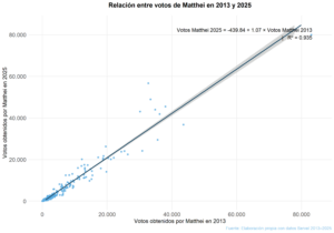 Llama la atención que en 2025 Matthei obtuvo un poco más de 1,6 millones de votos, cifra similar al total obtenido en primera vuelta de 2013, donde 1.648.481 personas (25,03% de los votos) votaron por Matthei. Es decir, en términos porcentuales empeoró, pero la cantidad de votantes casi no varió. Así, en cantidad de votos, Matthei casi no retrocedió respecto de su desempeño pasado, lo que sugiere que su desempeño en términos porcentuales se vio fuertemente afectado por el cambio de entorno.