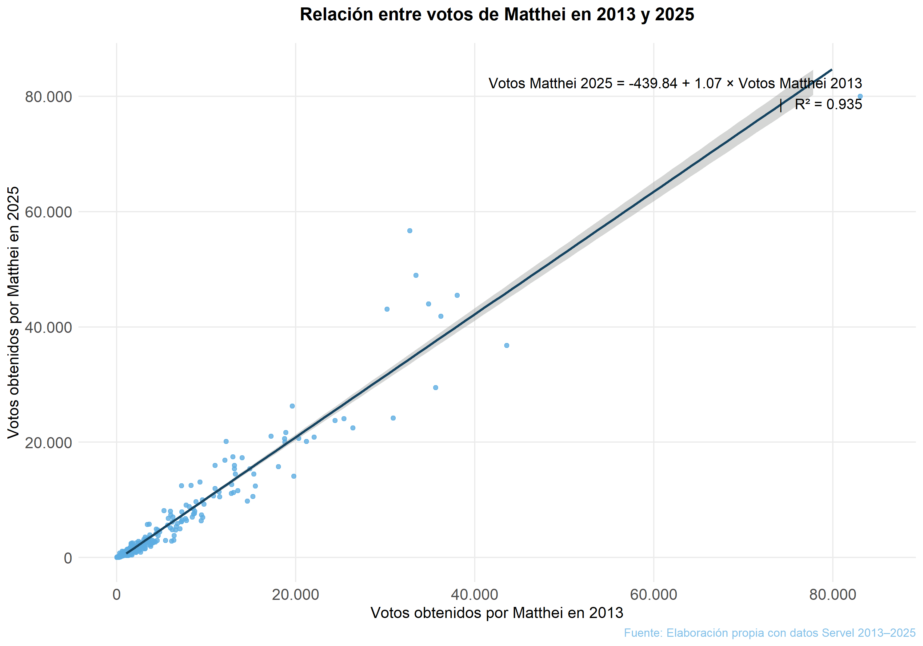 La figura a continuación confirma esta relación a nivel comunal. En el eje horizontal se muestra el número de votos obtenidos por Matthei en 2013, mientras que en el eje vertical se grafica su votación en 2025. Cada punto corresponde a una comuna. La línea de regresión revela una relación estrecha y positiva entre ambos valores: por cada 100 votos que Matthei obtuvo en una comuna en 2013, obtuvo aproximadamente 107 votos en 2025. Esto refuerza la idea de que el desempeño de Evelyn Matthei responde más a cambios en la competencia y composición del electorado que a una pérdida masiva de apoyo previo.