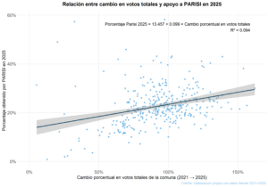 La figura a continuación ilustra gráficamente este resultado: en el eje horizontal se muestra el cambio porcentual en el total de votos emitidos entre 2021 y 2025 en cada comuna, mientras que en el eje vertical se representa el porcentaje de votos que Parisi obtuvo en la elección de 2025. Cada punto corresponde a una comuna distinta.