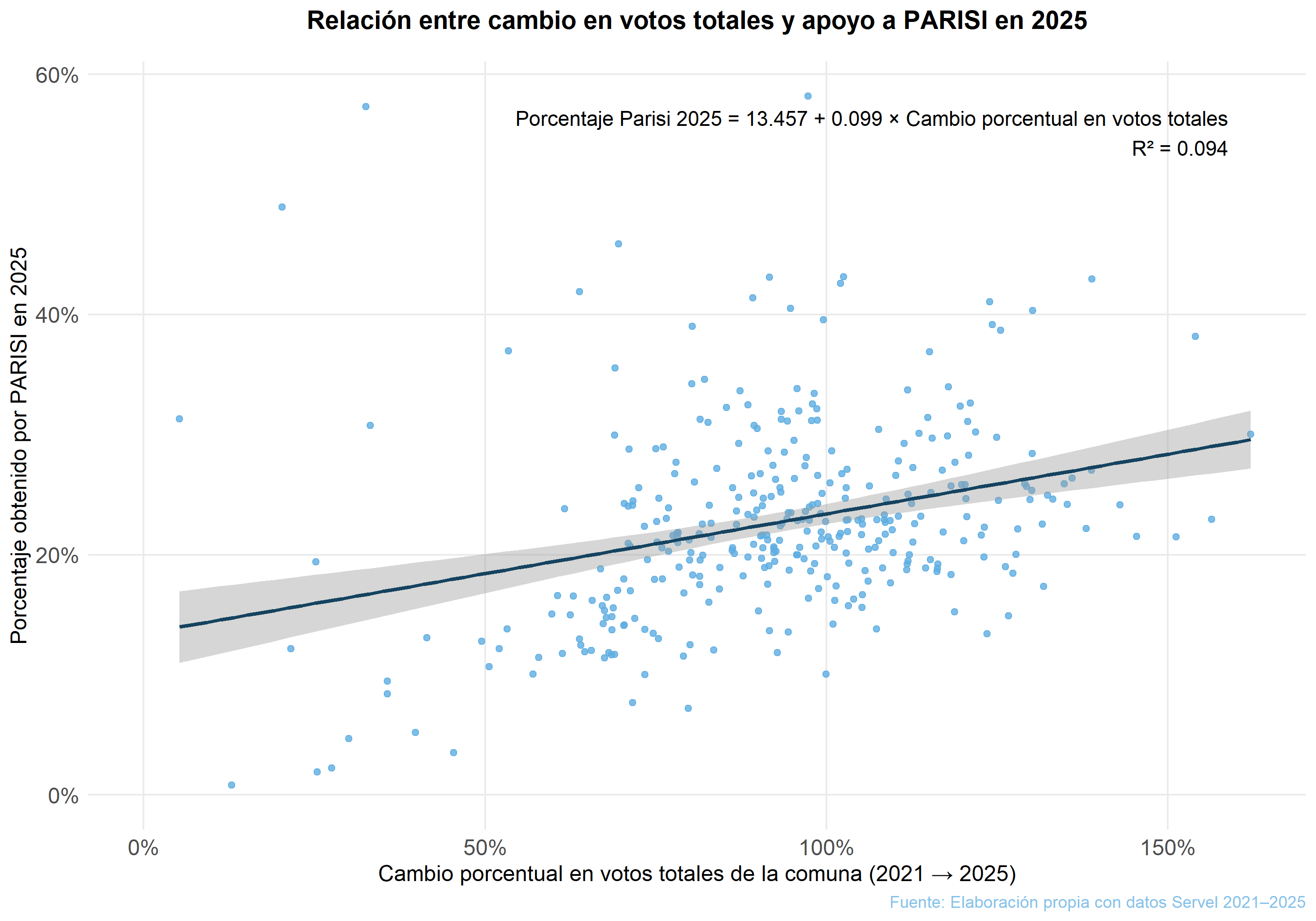 La pendiente positiva de la línea de regresión indica que, en promedio, a mayor aumento del número de votantes en una comuna, mayor es la votación obtenida por Parisi en 2025. El coeficiente estimado (0,099) cuantifica esta relación y se muestra en la esquina superior derecha del gráfico.