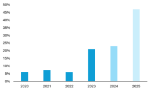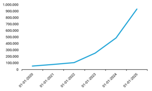 Según el sitio web Domain Name Stat, que rastrea registros de nombres de dominio, el número de sitios webs “.ai” ha aumentado más de diez veces en los últimos cinco años, desde cerca de 50.000 dominios en 2020 hasta más de 900.000 en 2025, y sólo en los últimos 12 meses se ha duplicado. En la Figura 1 se puede revisar con más detalle la evolución de cantidad de dominios desde 2020, considerando el total al 25 de octubre de cada año.